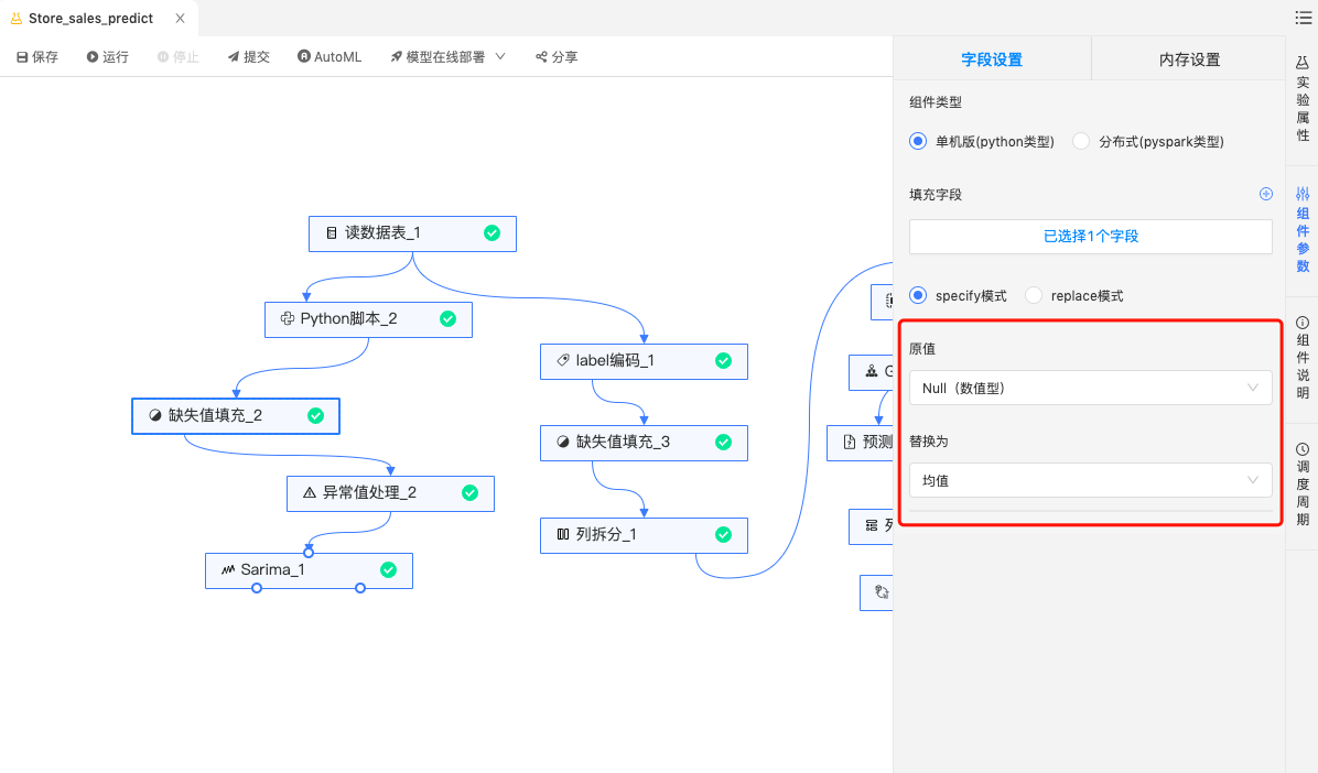 异常处理组件:采用z_score_3方法对销售额超出3-sigma的异常数据处理;