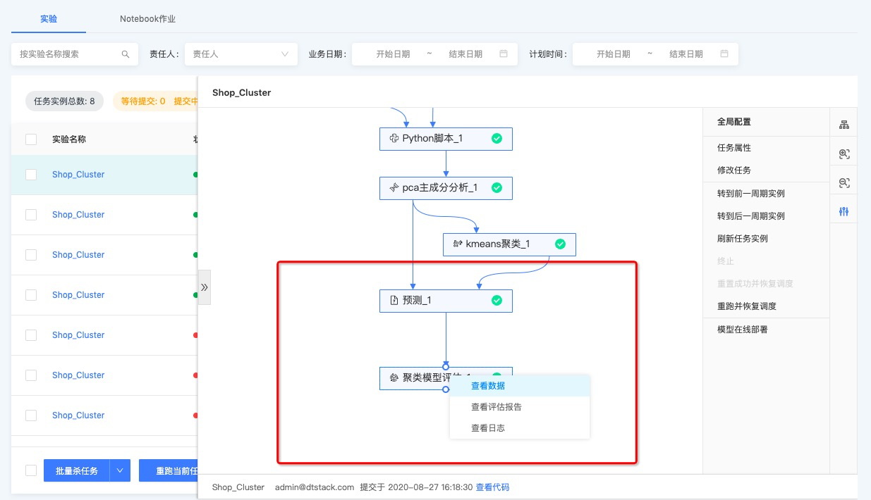 步骤四: 点击运行历史中某任务名称,查看训练任务的运行报告、各节点输出数据、模型评估效果。