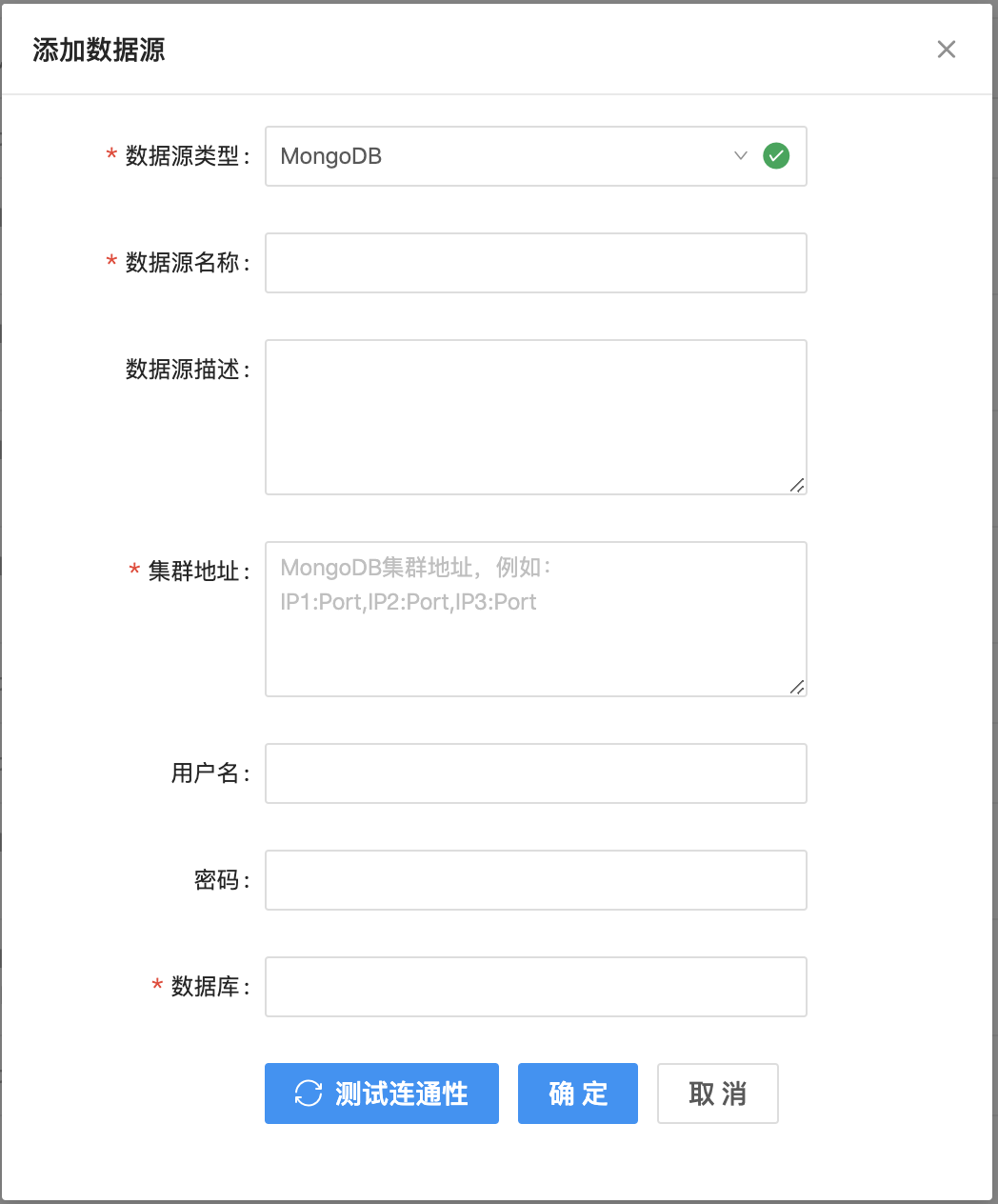 6.测试连通性通过后,点击 确定,即可完成MongoDB数据源的配置。